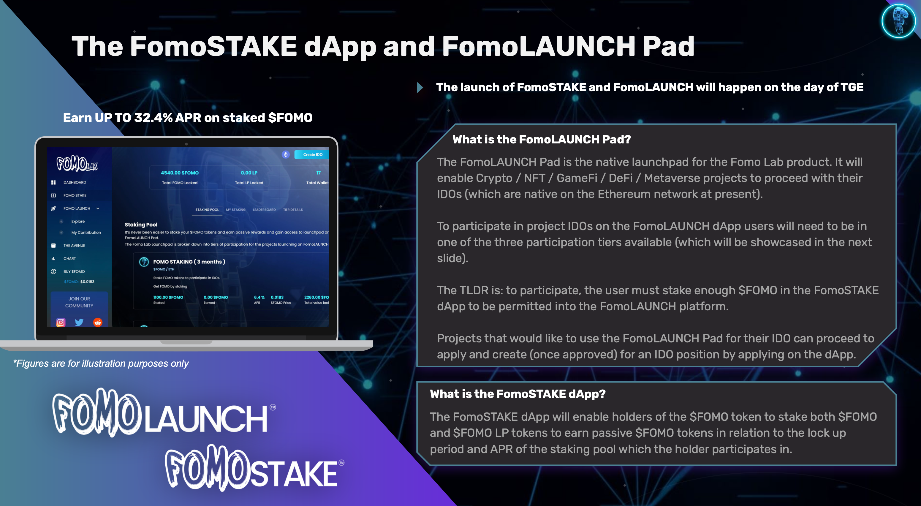 <figure><img src="https://3722726989-files.gitbook.io/~/files/v0/b/gitbook-x-prod.appspot.com/o/spaces%2FpyyPgs35ChVlsXNRCSA5%2Fuploads%2FIuVhqUx32oP1aFS5ksZN%2FScreenshot%202022-09-23%20at%2017.10.25.png?alt=media&#x26;token=5aebac72-8b7e-45f3-8c52-6bc4be226708" alt=""><figcaption><p>FomoSTAKE &#x26; FomoLAUNCH</p></figcaption></figure>